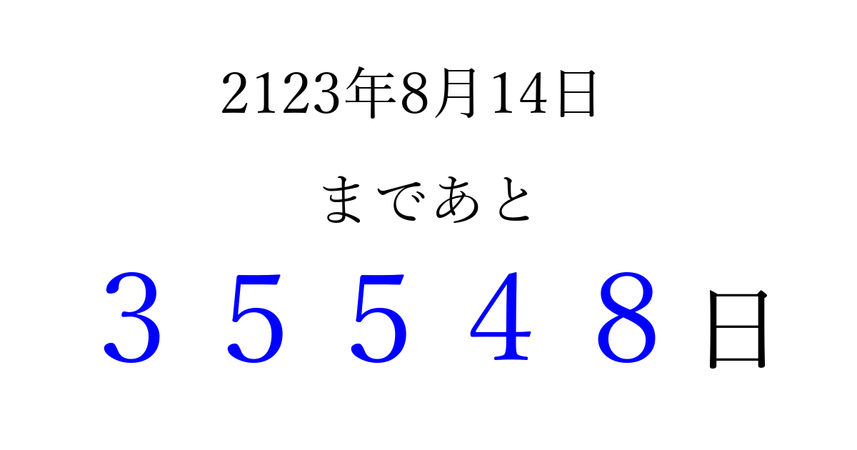 2123年8月14日(土)まで あと 99999 日です 追加すると、トップページからすぐ選べるようになります ※2026/04/16現在の結果です。 最新の状態に更新する ↓シェアして、タイムライン上にカウントダウンを表示しよう!↓ 📤 この結果を共有する Tweet シェア Threads Bluesky 別の日付でカウントダウン 2123年8月のカレンダー このページをブックマークに追加すると、いつでもカウントダウンを確認できます。 (PC: Ctrl+D / Mac: ⌘+D) hitome-notes.comでは以下のページも運営しています。 指定日と期間から日付を計算 | ガチャ確率計算・シミュレーション | プライバシー・ポリシー 運営者:Avocado