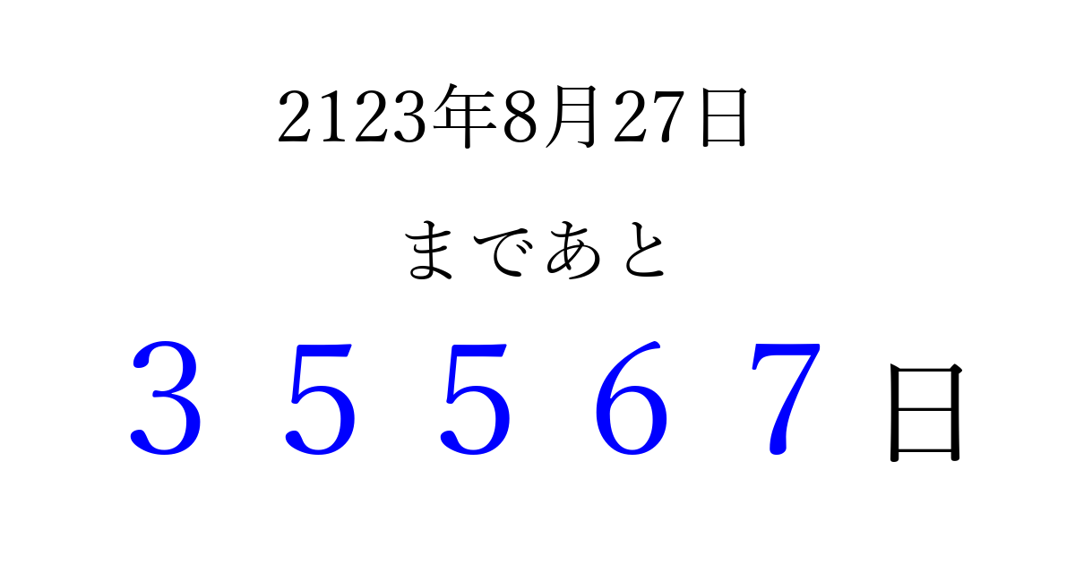 2123年8月27日(金)まで あと 99999 日です 追加すると、トップページからすぐ選べるようになります ※2026/04/10現在の結果です。 最新の状態に更新する ↓シェアして、タイムライン上にカウントダウンを表示しよう!↓ 📤 この結果を共有する Tweet シェア Threads Bluesky 別の日付でカウントダウン 2123年8月のカレンダー このページをブックマークに追加すると、いつでもカウントダウンを確認できます。 (PC: Ctrl+D / Mac: ⌘+D) hitome-notes.comでは以下のページも運営しています。 指定日と期間から日付を計算 | ガチャ確率計算・シミュレーション | プライバシー・ポリシー 運営者:Avocado
