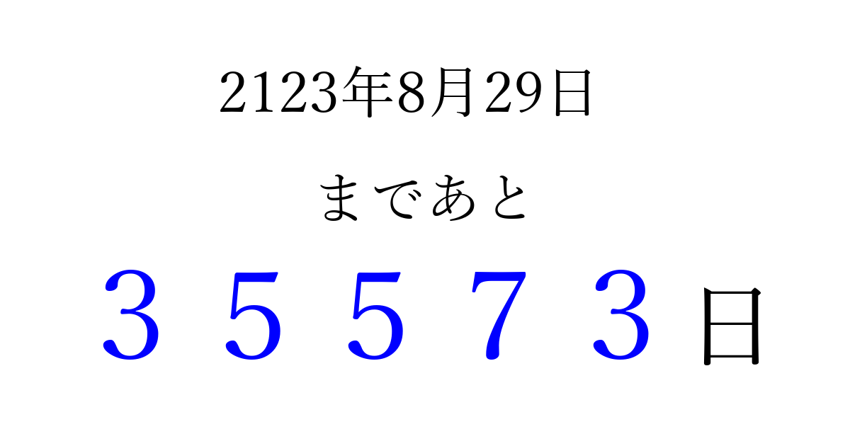 2123年8月29日(日)まで あと 99999 日です 追加すると、トップページからすぐ選べるようになります ※2026/04/06現在の結果です。 最新の状態に更新する ↓シェアして、タイムライン上にカウントダウンを表示しよう!↓ 📤 この結果を共有する Tweet シェア Threads Bluesky 別の日付でカウントダウン 2123年8月のカレンダー このページをブックマークに追加すると、いつでもカウントダウンを確認できます。 (PC: Ctrl+D / Mac: ⌘+D) hitome-notes.comでは以下のページも運営しています。 指定日と期間から日付を計算 | ガチャ確率計算・シミュレーション | プライバシー・ポリシー 運営者:Avocado