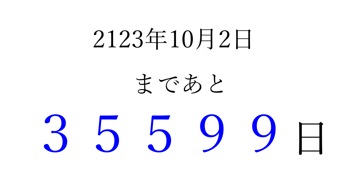2123年10月2日(土)まで あと 99999 日です 追加すると、トップページからすぐ選べるようになります ※2026/04/14現在の結果です。 最新の状態に更新する ↓シェアして、タイムライン上にカウントダウンを表示しよう!↓ 📤 この結果を共有する Tweet シェア Threads Bluesky 別の日付でカウントダウン 2123年10月のカレンダー このページをブックマークに追加すると、いつでもカウントダウンを確認できます。 (PC: Ctrl+D / Mac: ⌘+D) hitome-notes.comでは以下のページも運営しています。 指定日と期間から日付を計算 | ガチャ確率計算・シミュレーション | プライバシー・ポリシー 運営者:Avocado