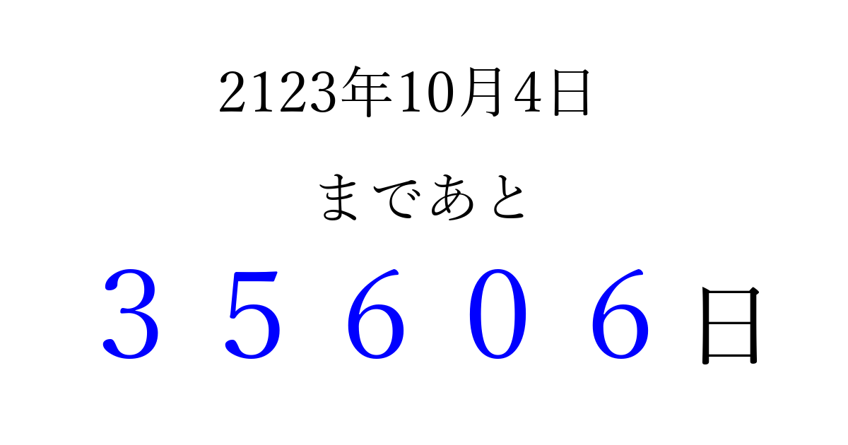 2123年10月4日(月)まで あと 99999 日です 追加すると、トップページからすぐ選べるようになります ※2026/04/09現在の結果です。 最新の状態に更新する ↓シェアして、タイムライン上にカウントダウンを表示しよう!↓ 📤 この結果を共有する Tweet シェア Threads Bluesky 別の日付でカウントダウン 2123年10月のカレンダー このページをブックマークに追加すると、いつでもカウントダウンを確認できます。 (PC: Ctrl+D / Mac: ⌘+D) hitome-notes.comでは以下のページも運営しています。 指定日と期間から日付を計算 | ガチャ確率計算・シミュレーション | プライバシー・ポリシー 運営者:Avocado