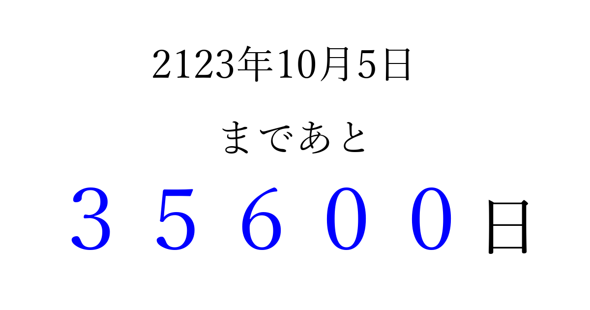 2123年10月5日(火)まで あと 99999 日です 追加すると、トップページからすぐ選べるようになります ※2026/04/16現在の結果です。 最新の状態に更新する ↓シェアして、タイムライン上にカウントダウンを表示しよう!↓ 📤 この結果を共有する Tweet シェア Threads Bluesky 別の日付でカウントダウン 2123年10月のカレンダー このページをブックマークに追加すると、いつでもカウントダウンを確認できます。 (PC: Ctrl+D / Mac: ⌘+D) hitome-notes.comでは以下のページも運営しています。 指定日と期間から日付を計算 | ガチャ確率計算・シミュレーション | プライバシー・ポリシー 運営者:Avocado