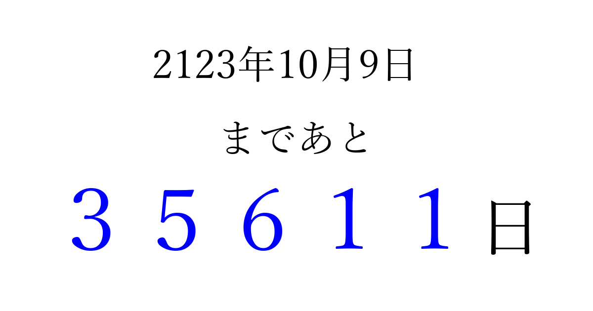 2123年10月9日(土)まで あと 99999 日です 追加すると、トップページからすぐ選べるようになります ※2026/04/09現在の結果です。 最新の状態に更新する ↓シェアして、タイムライン上にカウントダウンを表示しよう!↓ 📤 この結果を共有する Tweet シェア Threads Bluesky 別の日付でカウントダウン 2123年10月のカレンダー このページをブックマークに追加すると、いつでもカウントダウンを確認できます。 (PC: Ctrl+D / Mac: ⌘+D) hitome-notes.comでは以下のページも運営しています。 指定日と期間から日付を計算 | ガチャ確率計算・シミュレーション | プライバシー・ポリシー 運営者:Avocado