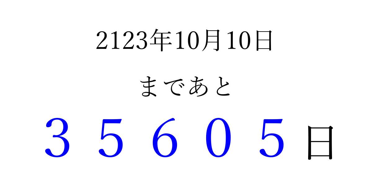2123年10月10日(日)まで あと 99999 日です 追加すると、トップページからすぐ選べるようになります ※2026/04/16現在の結果です。 最新の状態に更新する ↓シェアして、タイムライン上にカウントダウンを表示しよう!↓ 📤 この結果を共有する Tweet シェア Threads Bluesky 別の日付でカウントダウン 2123年10月のカレンダー このページをブックマークに追加すると、いつでもカウントダウンを確認できます。 (PC: Ctrl+D / Mac: ⌘+D) hitome-notes.comでは以下のページも運営しています。 指定日と期間から日付を計算 | ガチャ確率計算・シミュレーション | プライバシー・ポリシー 運営者:Avocado