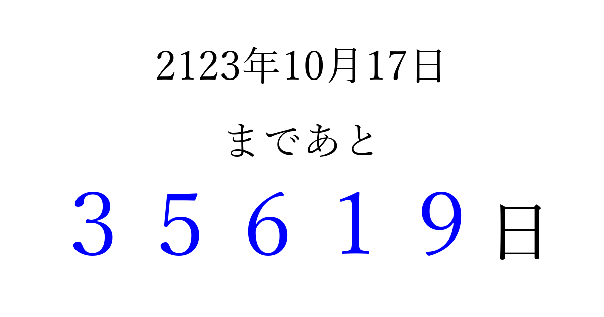 2123年10月17日(日)まで あと 99999 日です 追加すると、トップページからすぐ選べるようになります ※2026/04/09現在の結果です。 最新の状態に更新する ↓シェアして、タイムライン上にカウントダウンを表示しよう!↓ 📤 この結果を共有する Tweet シェア Threads Bluesky 別の日付でカウントダウン 2123年10月のカレンダー このページをブックマークに追加すると、いつでもカウントダウンを確認できます。 (PC: Ctrl+D / Mac: ⌘+D) hitome-notes.comでは以下のページも運営しています。 指定日と期間から日付を計算 | ガチャ確率計算・シミュレーション | プライバシー・ポリシー 運営者:Avocado