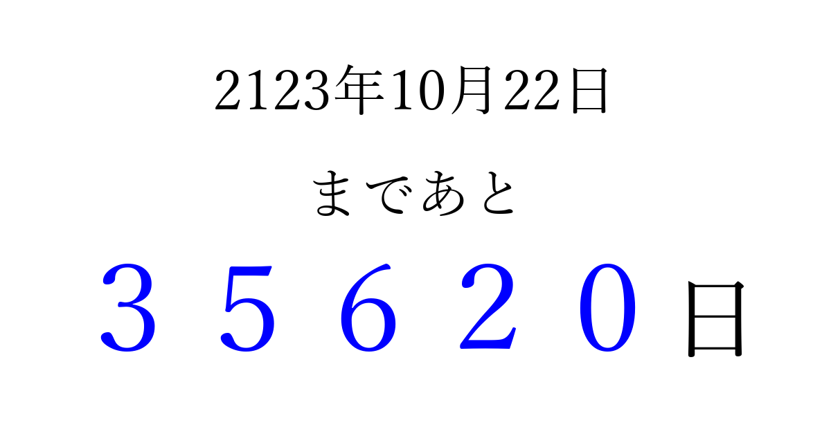 2123年10月22日(金)まで あと 99999 日です 追加すると、トップページからすぐ選べるようになります ※2026/04/13現在の結果です。 最新の状態に更新する ↓シェアして、タイムライン上にカウントダウンを表示しよう!↓ 📤 この結果を共有する Tweet シェア Threads Bluesky 別の日付でカウントダウン 2123年10月のカレンダー このページをブックマークに追加すると、いつでもカウントダウンを確認できます。 (PC: Ctrl+D / Mac: ⌘+D) hitome-notes.comでは以下のページも運営しています。 指定日と期間から日付を計算 | ガチャ確率計算・シミュレーション | プライバシー・ポリシー 運営者:Avocado