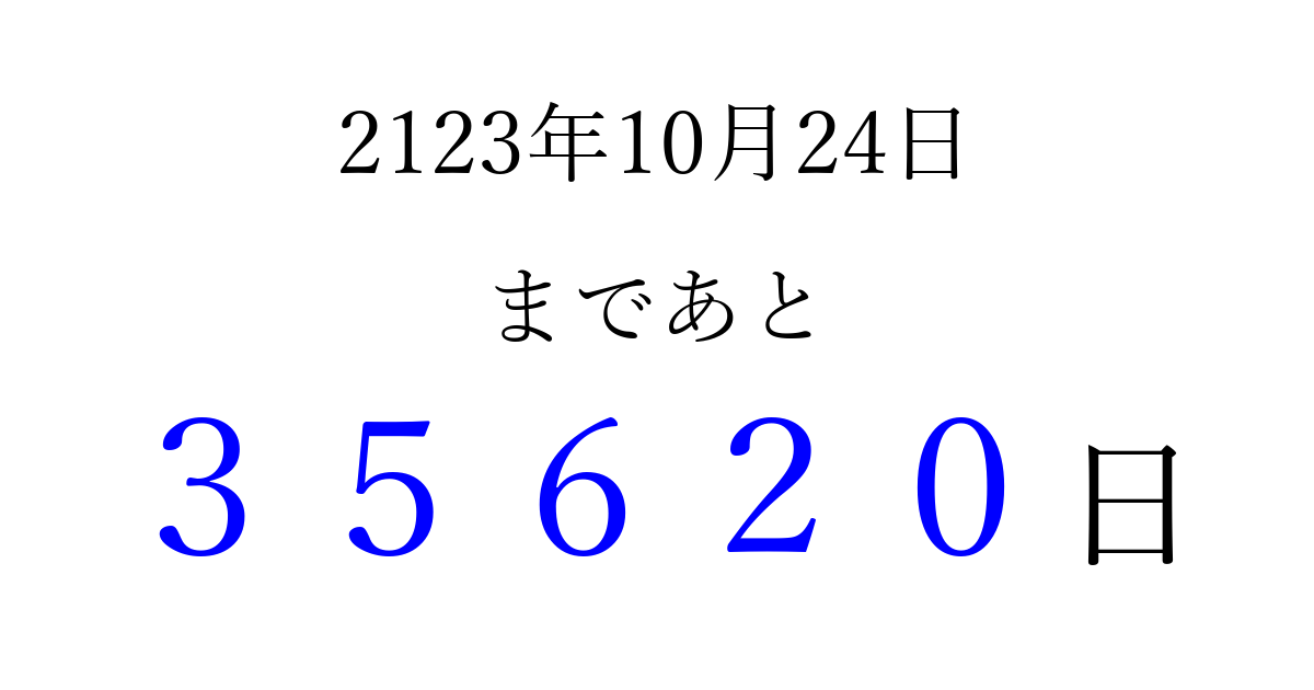 2123年10月24日(日)まで あと 99999 日です 追加すると、トップページからすぐ選べるようになります ※2026/04/15現在の結果です。 最新の状態に更新する ↓シェアして、タイムライン上にカウントダウンを表示しよう!↓ 📤 この結果を共有する Tweet シェア Threads Bluesky 別の日付でカウントダウン 2123年10月のカレンダー このページをブックマークに追加すると、いつでもカウントダウンを確認できます。 (PC: Ctrl+D / Mac: ⌘+D) hitome-notes.comでは以下のページも運営しています。 指定日と期間から日付を計算 | ガチャ確率計算・シミュレーション | プライバシー・ポリシー 運営者:Avocado