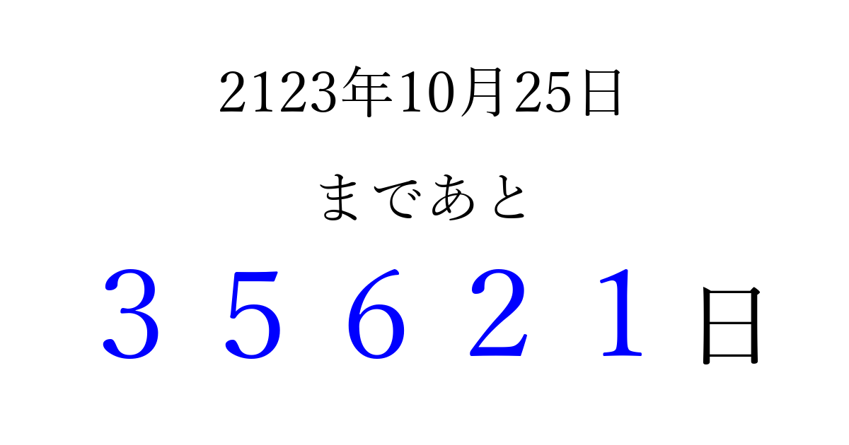 2123年10月25日(月)まで あと 99999 日です 追加すると、トップページからすぐ選べるようになります ※2026/04/15現在の結果です。 最新の状態に更新する ↓シェアして、タイムライン上にカウントダウンを表示しよう!↓ 📤 この結果を共有する Tweet シェア Threads Bluesky 別の日付でカウントダウン 2123年10月のカレンダー このページをブックマークに追加すると、いつでもカウントダウンを確認できます。 (PC: Ctrl+D / Mac: ⌘+D) hitome-notes.comでは以下のページも運営しています。 指定日と期間から日付を計算 | ガチャ確率計算・シミュレーション | プライバシー・ポリシー 運営者:Avocado