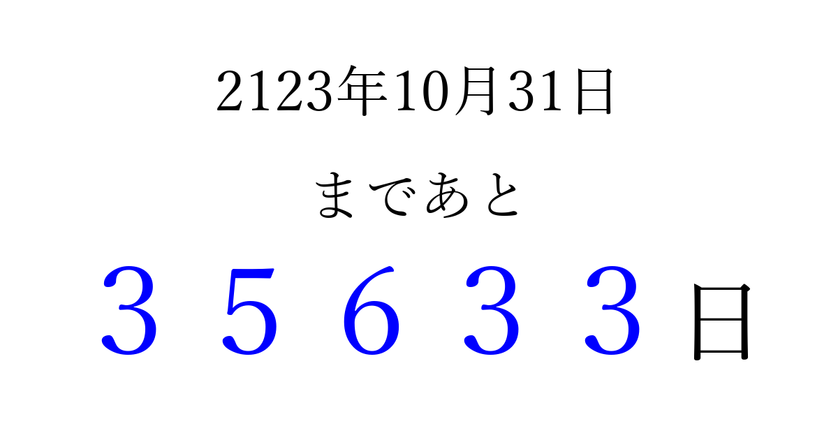 2123年10月31日(日)まで あと 99999 日です 追加すると、トップページからすぐ選べるようになります ※2026/04/09現在の結果です。 最新の状態に更新する ↓シェアして、タイムライン上にカウントダウンを表示しよう!↓ 📤 この結果を共有する Tweet シェア Threads Bluesky 別の日付でカウントダウン 2123年10月のカレンダー このページをブックマークに追加すると、いつでもカウントダウンを確認できます。 (PC: Ctrl+D / Mac: ⌘+D) hitome-notes.comでは以下のページも運営しています。 指定日と期間から日付を計算 | ガチャ確率計算・シミュレーション | プライバシー・ポリシー 運営者:Avocado
