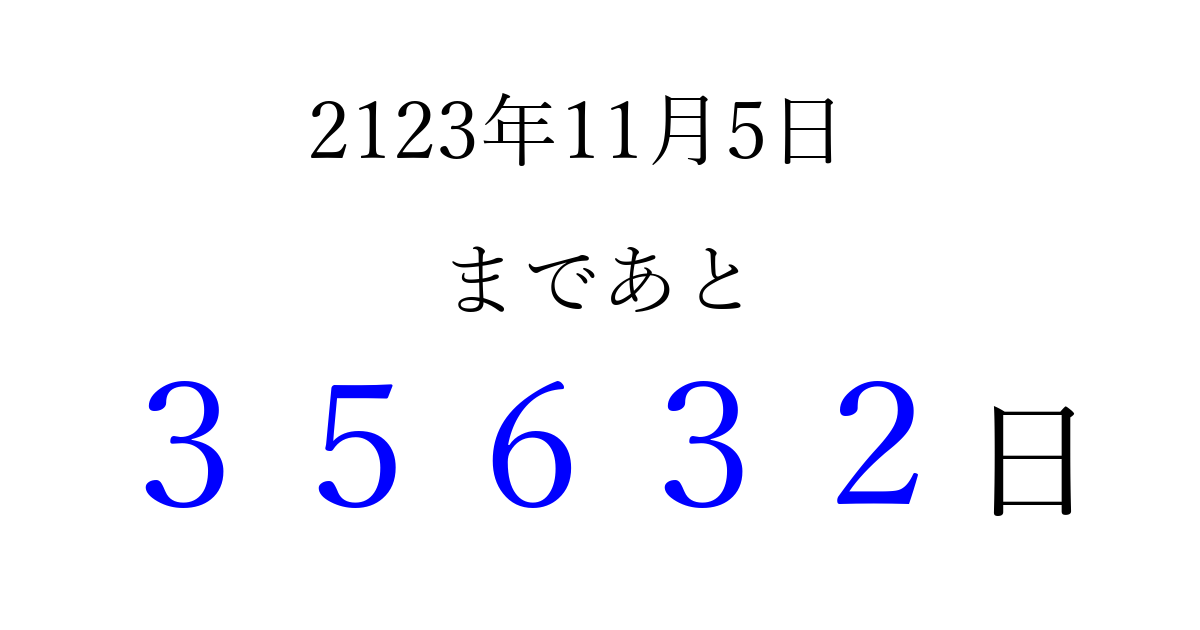 2123年11月5日(金)まで あと 99999 日です 追加すると、トップページからすぐ選べるようになります ※2026/04/15現在の結果です。 最新の状態に更新する ↓シェアして、タイムライン上にカウントダウンを表示しよう!↓ 📤 この結果を共有する Tweet シェア Threads Bluesky 別の日付でカウントダウン 2123年11月のカレンダー このページをブックマークに追加すると、いつでもカウントダウンを確認できます。 (PC: Ctrl+D / Mac: ⌘+D) hitome-notes.comでは以下のページも運営しています。 指定日と期間から日付を計算 | ガチャ確率計算・シミュレーション | プライバシー・ポリシー 運営者:Avocado