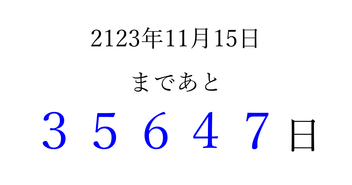 2123年11月15日(月)まで あと 99999 日です 追加すると、トップページからすぐ選べるようになります ※2026/04/10現在の結果です。 最新の状態に更新する ↓シェアして、タイムライン上にカウントダウンを表示しよう!↓ 📤 この結果を共有する Tweet シェア Threads Bluesky 別の日付でカウントダウン 2123年11月のカレンダー このページをブックマークに追加すると、いつでもカウントダウンを確認できます。 (PC: Ctrl+D / Mac: ⌘+D) hitome-notes.comでは以下のページも運営しています。 指定日と期間から日付を計算 | ガチャ確率計算・シミュレーション | プライバシー・ポリシー 運営者:Avocado