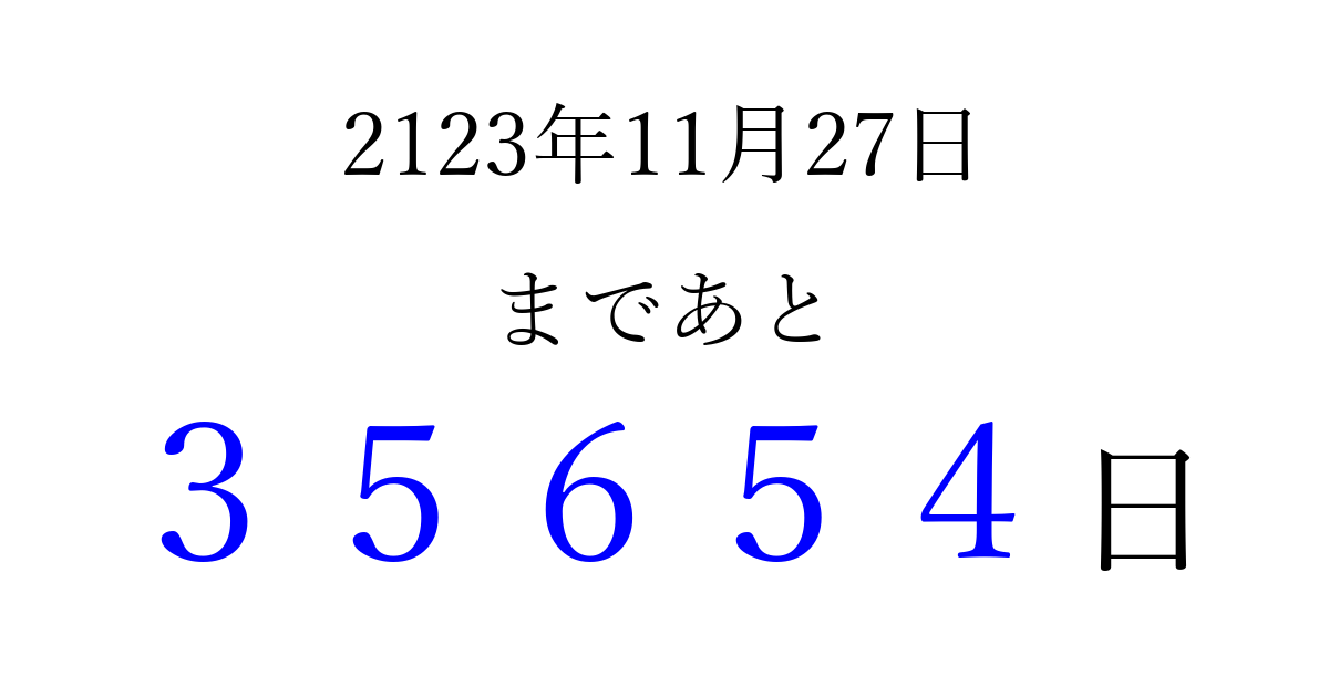 2123年11月27日(土)まで あと 99999 日です 追加すると、トップページからすぐ選べるようになります ※2026/04/15現在の結果です。 最新の状態に更新する ↓シェアして、タイムライン上にカウントダウンを表示しよう!↓ 📤 この結果を共有する Tweet シェア Threads Bluesky 別の日付でカウントダウン 2123年11月のカレンダー このページをブックマークに追加すると、いつでもカウントダウンを確認できます。 (PC: Ctrl+D / Mac: ⌘+D) hitome-notes.comでは以下のページも運営しています。 指定日と期間から日付を計算 | ガチャ確率計算・シミュレーション | プライバシー・ポリシー 運営者:Avocado