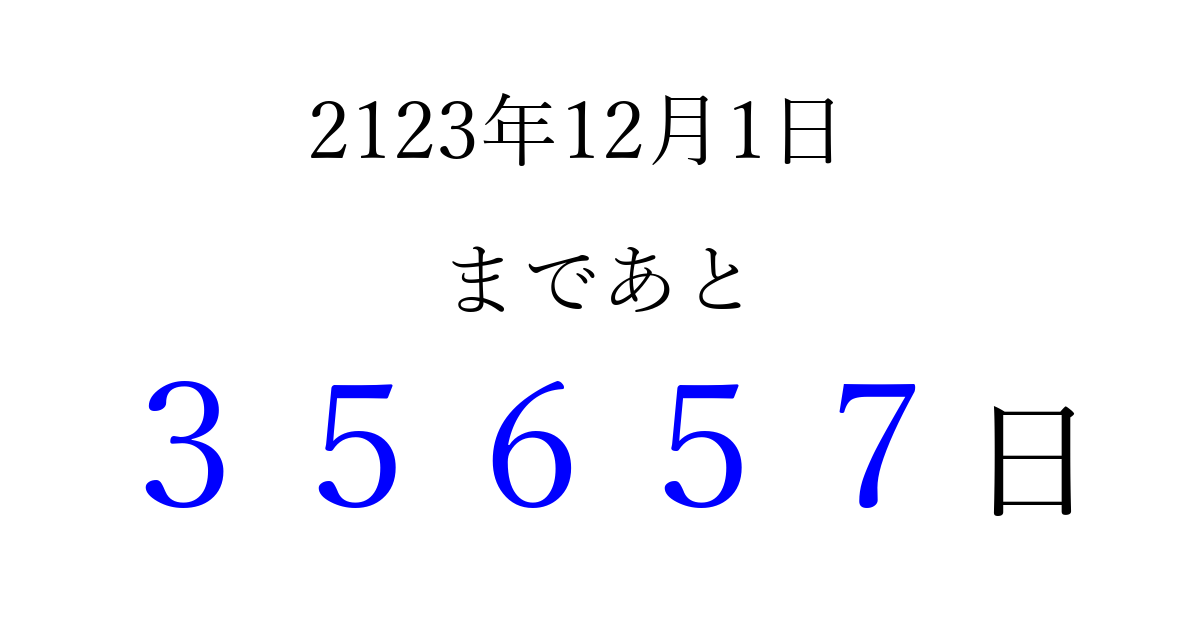 2123年12月1日(水)まで あと 99999 日です 追加すると、トップページからすぐ選べるようになります ※2026/04/16現在の結果です。 最新の状態に更新する ↓シェアして、タイムライン上にカウントダウンを表示しよう!↓ 📤 この結果を共有する Tweet シェア Threads Bluesky 別の日付でカウントダウン 2123年12月のカレンダー このページをブックマークに追加すると、いつでもカウントダウンを確認できます。 (PC: Ctrl+D / Mac: ⌘+D) hitome-notes.comでは以下のページも運営しています。 指定日と期間から日付を計算 | ガチャ確率計算・シミュレーション | プライバシー・ポリシー 運営者:Avocado