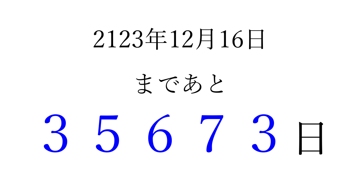 2123年12月16日(木)まで あと 99999 日です 追加すると、トップページからすぐ選べるようになります ※2026/04/15現在の結果です。 最新の状態に更新する ↓シェアして、タイムライン上にカウントダウンを表示しよう!↓ 📤 この結果を共有する Tweet シェア Threads Bluesky 別の日付でカウントダウン 2123年12月のカレンダー このページをブックマークに追加すると、いつでもカウントダウンを確認できます。 (PC: Ctrl+D / Mac: ⌘+D) hitome-notes.comでは以下のページも運営しています。 指定日と期間から日付を計算 | ガチャ確率計算・シミュレーション | プライバシー・ポリシー 運営者:Avocado