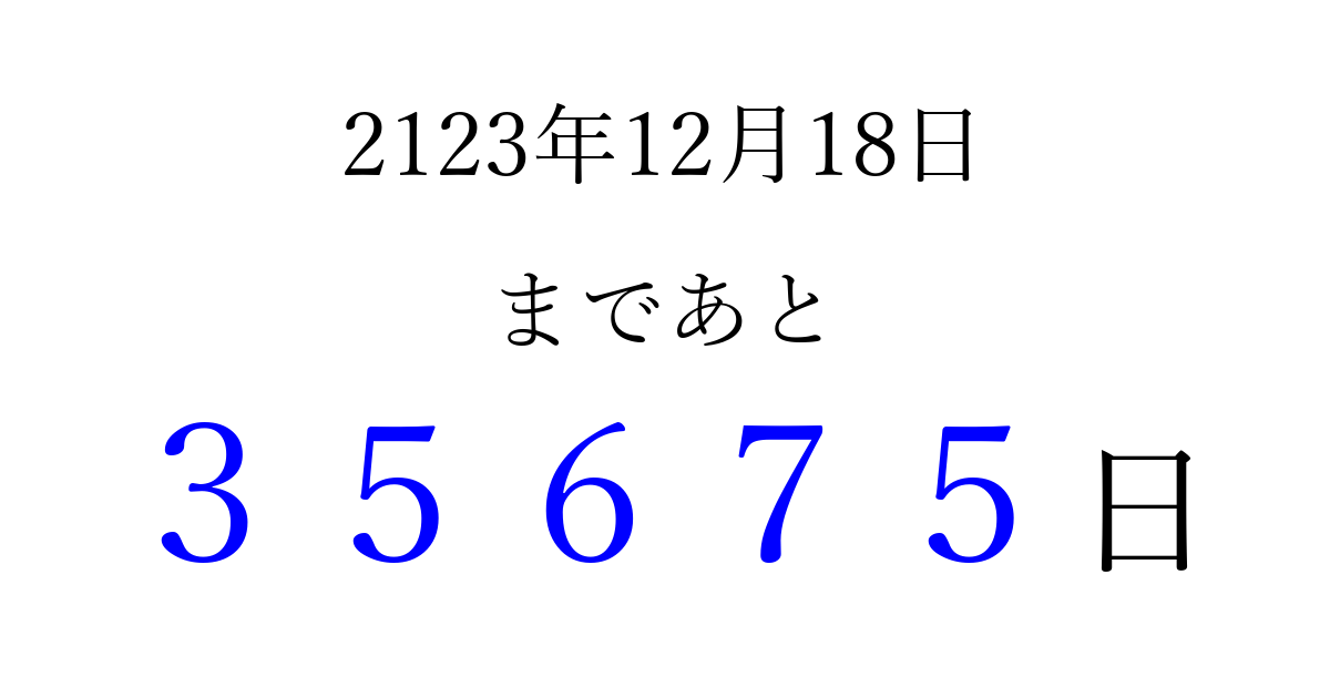 2123年12月18日(土)まで あと 99999 日です 追加すると、トップページからすぐ選べるようになります ※2026/04/16現在の結果です。 最新の状態に更新する ↓シェアして、タイムライン上にカウントダウンを表示しよう!↓ 📤 この結果を共有する Tweet シェア Threads Bluesky 別の日付でカウントダウン 2123年12月のカレンダー このページをブックマークに追加すると、いつでもカウントダウンを確認できます。 (PC: Ctrl+D / Mac: ⌘+D) hitome-notes.comでは以下のページも運営しています。 指定日と期間から日付を計算 | ガチャ確率計算・シミュレーション | プライバシー・ポリシー 運営者:Avocado