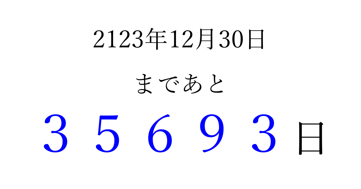 2123年12月30日(木)まで あと 99999 日です 追加すると、トップページからすぐ選べるようになります ※2026/04/09現在の結果です。 最新の状態に更新する ↓シェアして、タイムライン上にカウントダウンを表示しよう!↓ 📤 この結果を共有する Tweet シェア Threads Bluesky 別の日付でカウントダウン 2123年12月のカレンダー このページをブックマークに追加すると、いつでもカウントダウンを確認できます。 (PC: Ctrl+D / Mac: ⌘+D) hitome-notes.comでは以下のページも運営しています。 指定日と期間から日付を計算 | ガチャ確率計算・シミュレーション | プライバシー・ポリシー 運営者:Avocado