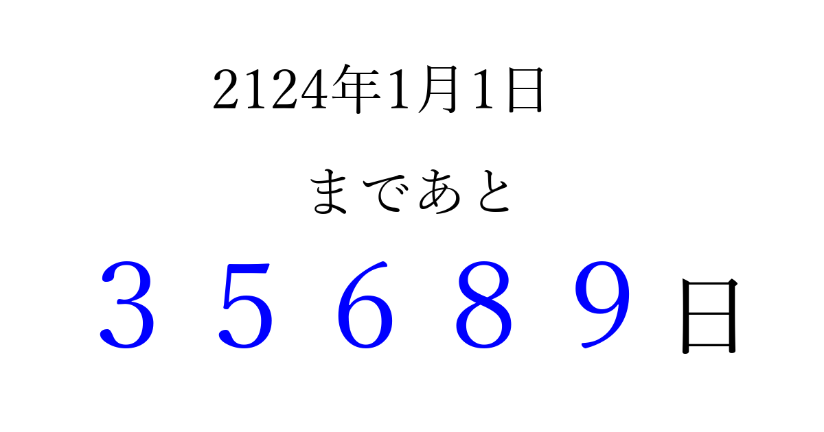 2124年1月1日(土)まで あと 99999 日です 追加すると、トップページからすぐ選べるようになります ※2026/04/15現在の結果です。 最新の状態に更新する ↓シェアして、タイムライン上にカウントダウンを表示しよう!↓ 📤 この結果を共有する Tweet シェア Threads Bluesky 別の日付でカウントダウン 2124年1月のカレンダー このページをブックマークに追加すると、いつでもカウントダウンを確認できます。 (PC: Ctrl+D / Mac: ⌘+D) hitome-notes.comでは以下のページも運営しています。 指定日と期間から日付を計算 | ガチャ確率計算・シミュレーション | プライバシー・ポリシー 運営者:Avocado
