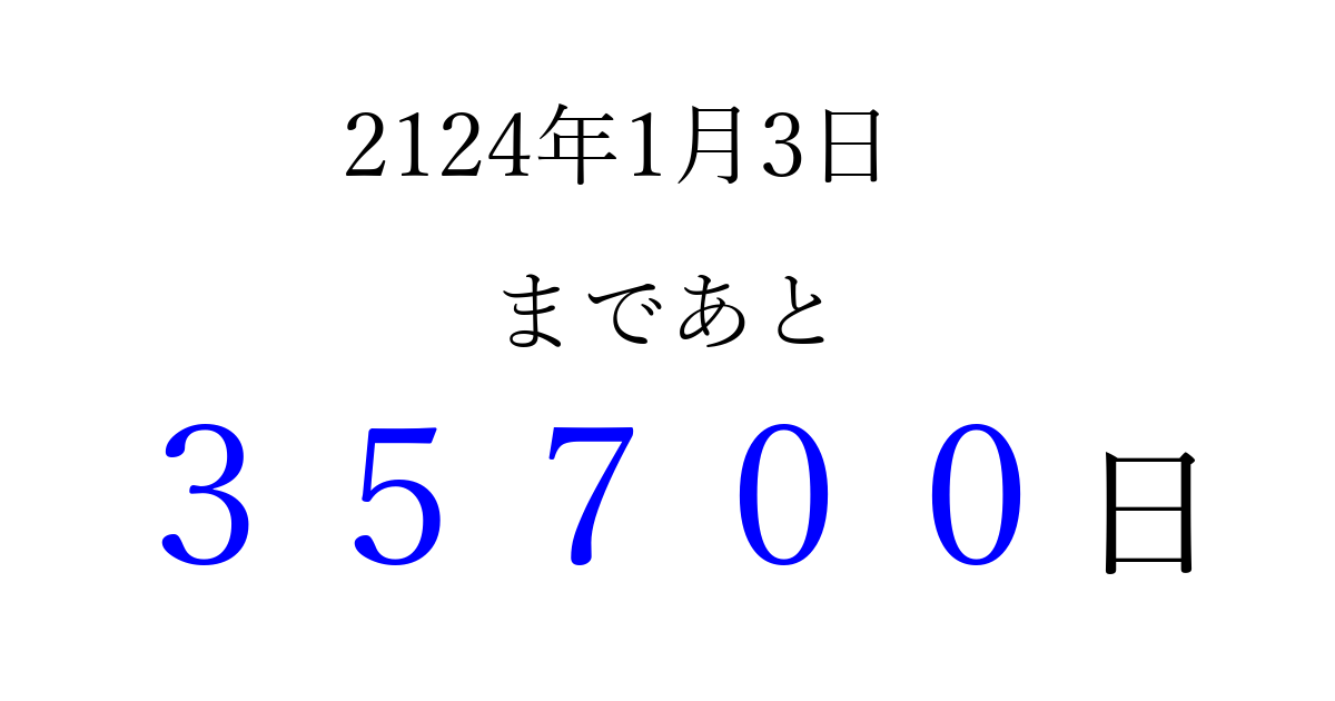 2124年1月3日(月)まで あと 99999 日です 追加すると、トップページからすぐ選べるようになります ※2026/04/06現在の結果です。 最新の状態に更新する ↓シェアして、タイムライン上にカウントダウンを表示しよう!↓ 📤 この結果を共有する Tweet シェア Threads Bluesky 別の日付でカウントダウン 2124年1月のカレンダー このページをブックマークに追加すると、いつでもカウントダウンを確認できます。 (PC: Ctrl+D / Mac: ⌘+D) hitome-notes.comでは以下のページも運営しています。 指定日と期間から日付を計算 | ガチャ確率計算・シミュレーション | プライバシー・ポリシー 運営者:Avocado