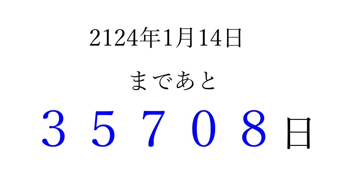 2124年1月14日(金)まで あと 99999 日です 追加すると、トップページからすぐ選べるようになります ※2026/04/09現在の結果です。 最新の状態に更新する ↓シェアして、タイムライン上にカウントダウンを表示しよう!↓ 📤 この結果を共有する Tweet シェア Threads Bluesky 別の日付でカウントダウン 2124年1月のカレンダー このページをブックマークに追加すると、いつでもカウントダウンを確認できます。 (PC: Ctrl+D / Mac: ⌘+D) hitome-notes.comでは以下のページも運営しています。 指定日と期間から日付を計算 | ガチャ確率計算・シミュレーション | プライバシー・ポリシー 運営者:Avocado