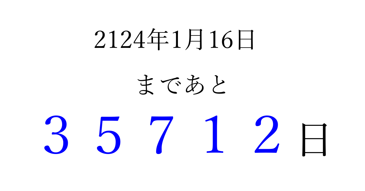 2124年1月16日(日)まで あと 99999 日です 追加すると、トップページからすぐ選べるようになります ※2026/04/07現在の結果です。 最新の状態に更新する ↓シェアして、タイムライン上にカウントダウンを表示しよう!↓ 📤 この結果を共有する Tweet シェア Threads Bluesky 別の日付でカウントダウン 2124年1月のカレンダー このページをブックマークに追加すると、いつでもカウントダウンを確認できます。 (PC: Ctrl+D / Mac: ⌘+D) hitome-notes.comでは以下のページも運営しています。 指定日と期間から日付を計算 | ガチャ確率計算・シミュレーション | プライバシー・ポリシー 運営者:Avocado