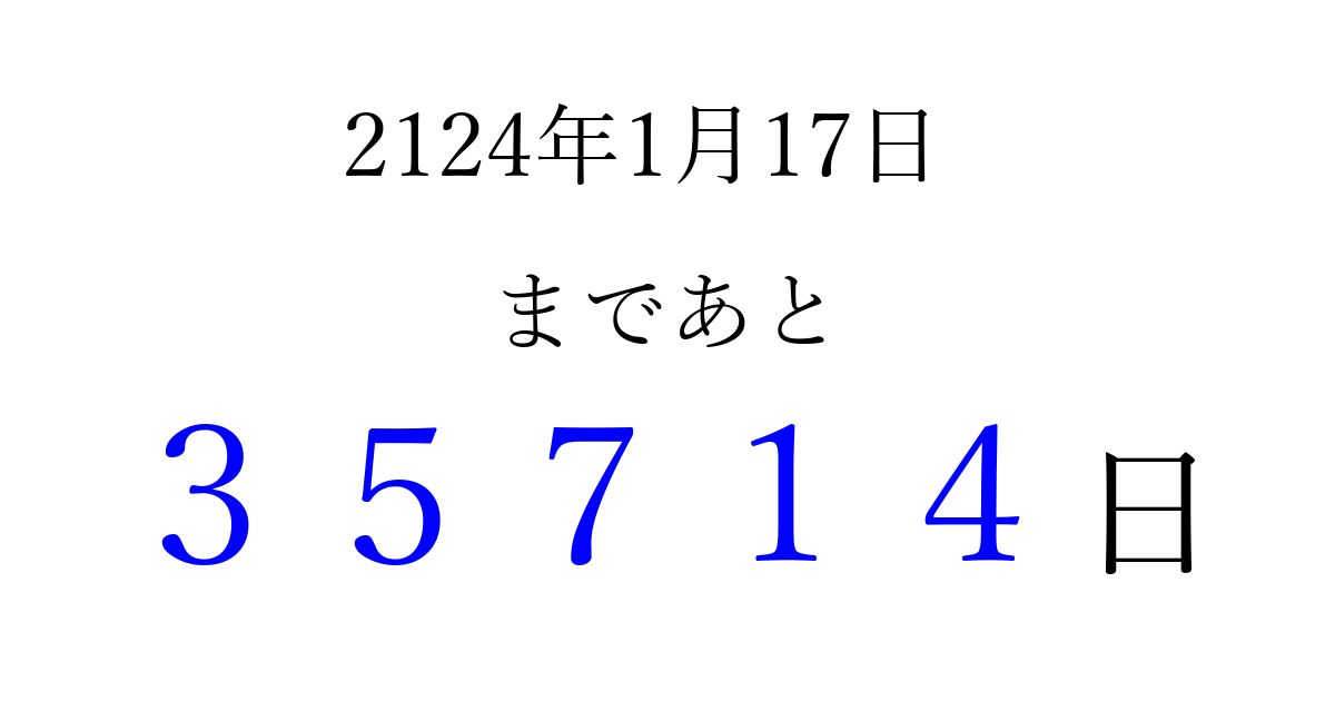 2124年1月17日(月)まで あと 99999 日です 追加すると、トップページからすぐ選べるようになります ※2026/04/06現在の結果です。 最新の状態に更新する ↓シェアして、タイムライン上にカウントダウンを表示しよう!↓ 📤 この結果を共有する Tweet シェア Threads Bluesky 別の日付でカウントダウン 2124年1月のカレンダー このページをブックマークに追加すると、いつでもカウントダウンを確認できます。 (PC: Ctrl+D / Mac: ⌘+D) hitome-notes.comでは以下のページも運営しています。 指定日と期間から日付を計算 | ガチャ確率計算・シミュレーション | プライバシー・ポリシー 運営者:Avocado