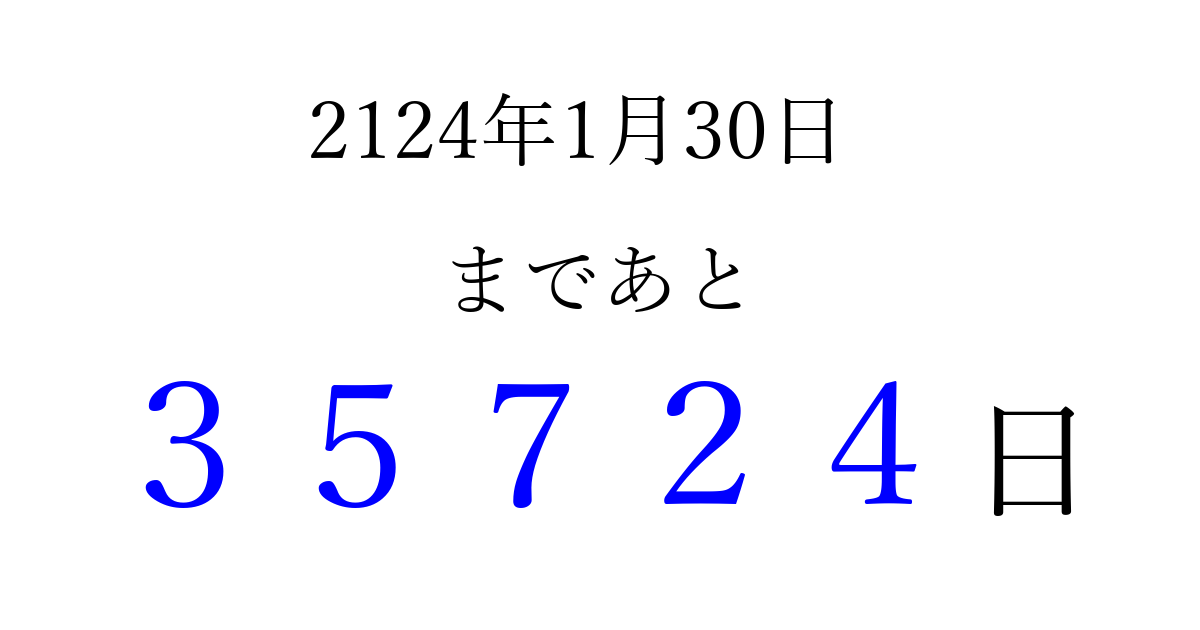 2124年1月30日(日)まで あと 99999 日です 追加すると、トップページからすぐ選べるようになります ※2026/04/09現在の結果です。 最新の状態に更新する ↓シェアして、タイムライン上にカウントダウンを表示しよう!↓ 📤 この結果を共有する Tweet シェア Threads Bluesky 別の日付でカウントダウン 2124年1月のカレンダー このページをブックマークに追加すると、いつでもカウントダウンを確認できます。 (PC: Ctrl+D / Mac: ⌘+D) hitome-notes.comでは以下のページも運営しています。 指定日と期間から日付を計算 | ガチャ確率計算・シミュレーション | プライバシー・ポリシー 運営者:Avocado