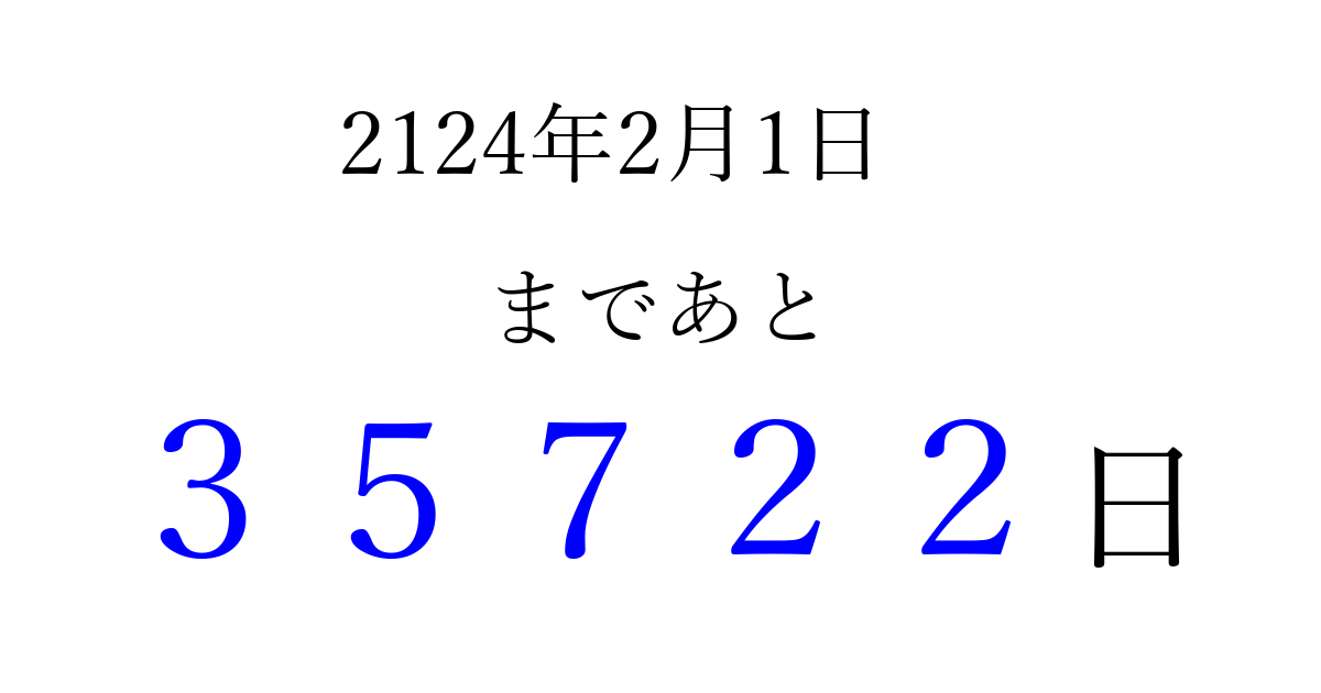 2124年2月1日(火)まで あと 99999 日です 追加すると、トップページからすぐ選べるようになります ※2026/04/13現在の結果です。 最新の状態に更新する ↓シェアして、タイムライン上にカウントダウンを表示しよう!↓ 📤 この結果を共有する Tweet シェア Threads Bluesky 別の日付でカウントダウン 2124年2月のカレンダー このページをブックマークに追加すると、いつでもカウントダウンを確認できます。 (PC: Ctrl+D / Mac: ⌘+D) hitome-notes.comでは以下のページも運営しています。 指定日と期間から日付を計算 | ガチャ確率計算・シミュレーション | プライバシー・ポリシー 運営者:Avocado