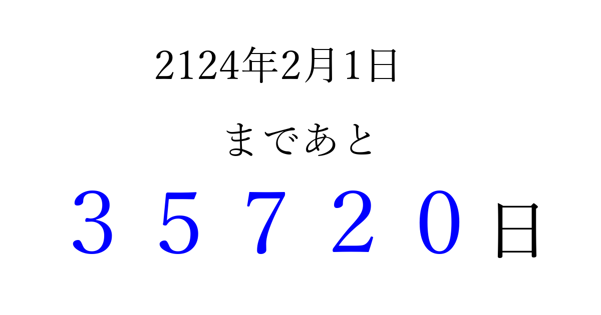 2124年2月1日(火)まで あと 99999 日です 追加すると、トップページからすぐ選べるようになります ※2026/04/15現在の結果です。 最新の状態に更新する ↓シェアして、タイムライン上にカウントダウンを表示しよう!↓ 📤 この結果を共有する Tweet シェア Threads Bluesky 別の日付でカウントダウン 2124年2月のカレンダー このページをブックマークに追加すると、いつでもカウントダウンを確認できます。 (PC: Ctrl+D / Mac: ⌘+D) hitome-notes.comでは以下のページも運営しています。 指定日と期間から日付を計算 | ガチャ確率計算・シミュレーション | プライバシー・ポリシー 運営者:Avocado
