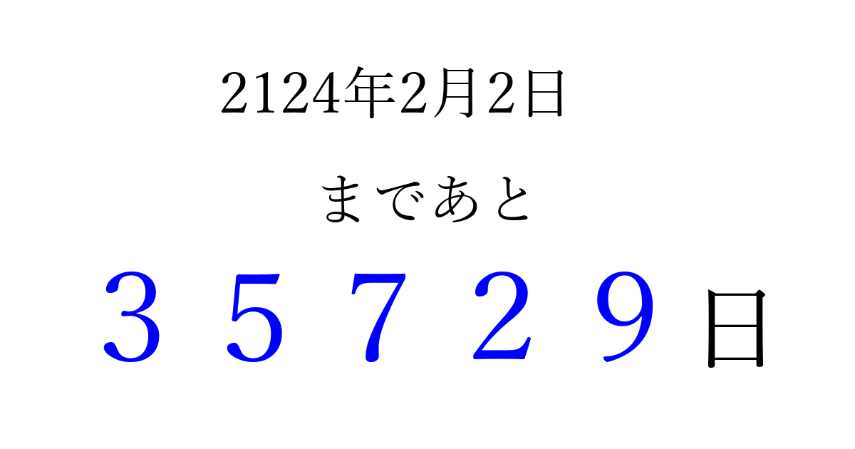 2124年2月2日(水)まで あと 99999 日です 追加すると、トップページからすぐ選べるようになります ※2026/04/07現在の結果です。 最新の状態に更新する ↓シェアして、タイムライン上にカウントダウンを表示しよう!↓ 📤 この結果を共有する Tweet シェア Threads Bluesky 別の日付でカウントダウン 2124年2月のカレンダー このページをブックマークに追加すると、いつでもカウントダウンを確認できます。 (PC: Ctrl+D / Mac: ⌘+D) hitome-notes.comでは以下のページも運営しています。 指定日と期間から日付を計算 | ガチャ確率計算・シミュレーション | プライバシー・ポリシー 運営者:Avocado