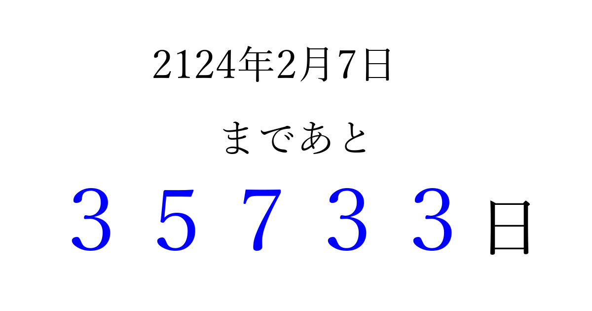 2124年2月7日(月)まで あと 99999 日です 追加すると、トップページからすぐ選べるようになります ※2026/04/08現在の結果です。 最新の状態に更新する ↓シェアして、タイムライン上にカウントダウンを表示しよう!↓ 📤 この結果を共有する Tweet シェア Threads Bluesky 別の日付でカウントダウン 2124年2月のカレンダー このページをブックマークに追加すると、いつでもカウントダウンを確認できます。 (PC: Ctrl+D / Mac: ⌘+D) hitome-notes.comでは以下のページも運営しています。 指定日と期間から日付を計算 | ガチャ確率計算・シミュレーション | プライバシー・ポリシー 運営者:Avocado