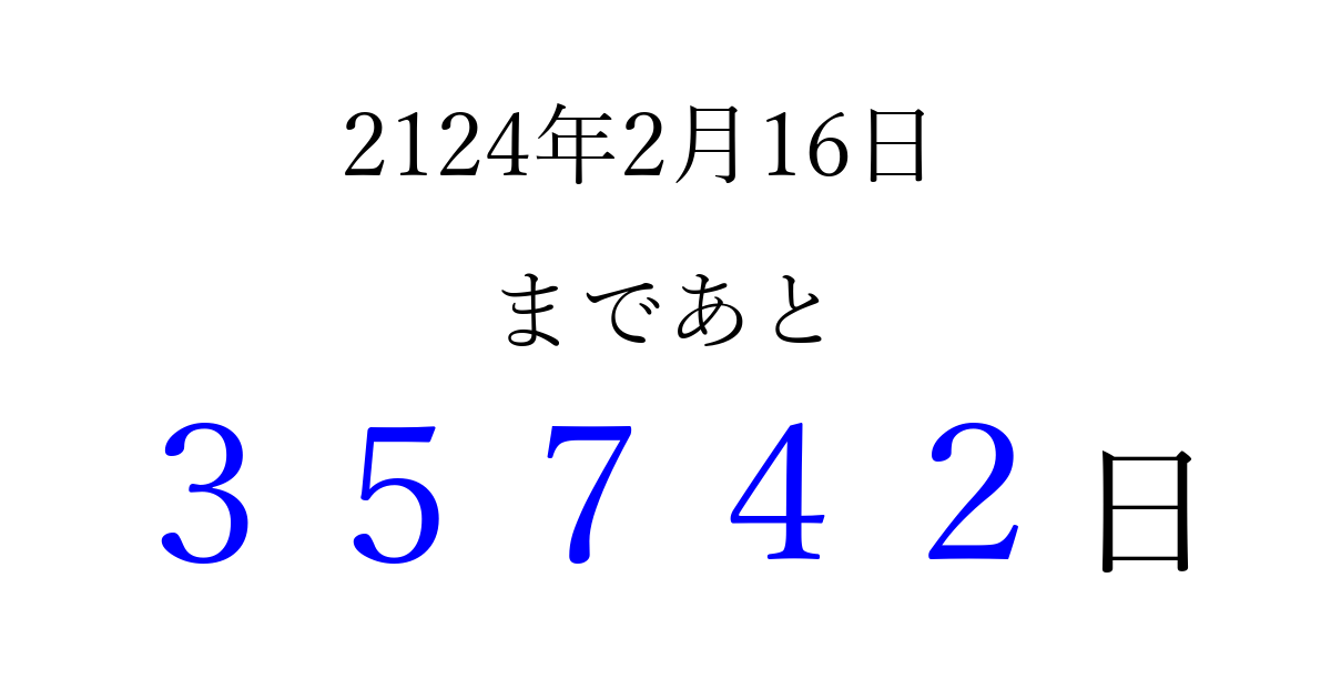 2124年2月16日(水)まで あと 99999 日です 追加すると、トップページからすぐ選べるようになります ※2026/04/08現在の結果です。 最新の状態に更新する ↓シェアして、タイムライン上にカウントダウンを表示しよう!↓ 📤 この結果を共有する Tweet シェア Threads Bluesky 別の日付でカウントダウン 2124年2月のカレンダー このページをブックマークに追加すると、いつでもカウントダウンを確認できます。 (PC: Ctrl+D / Mac: ⌘+D) hitome-notes.comでは以下のページも運営しています。 指定日と期間から日付を計算 | ガチャ確率計算・シミュレーション | プライバシー・ポリシー 運営者:Avocado