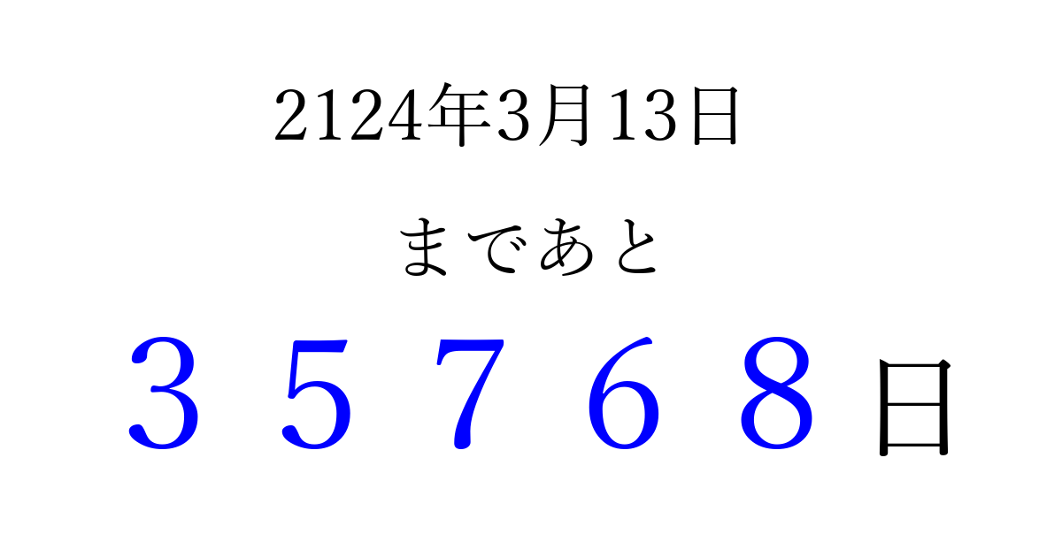 2124年3月13日(月)まで あと 99999 日です 追加すると、トップページからすぐ選べるようになります ※2026/04/08現在の結果です。 最新の状態に更新する ↓シェアして、タイムライン上にカウントダウンを表示しよう!↓ 📤 この結果を共有する Tweet シェア Threads Bluesky 別の日付でカウントダウン 2124年3月のカレンダー このページをブックマークに追加すると、いつでもカウントダウンを確認できます。 (PC: Ctrl+D / Mac: ⌘+D) hitome-notes.comでは以下のページも運営しています。 指定日と期間から日付を計算 | ガチャ確率計算・シミュレーション | プライバシー・ポリシー 運営者:Avocado