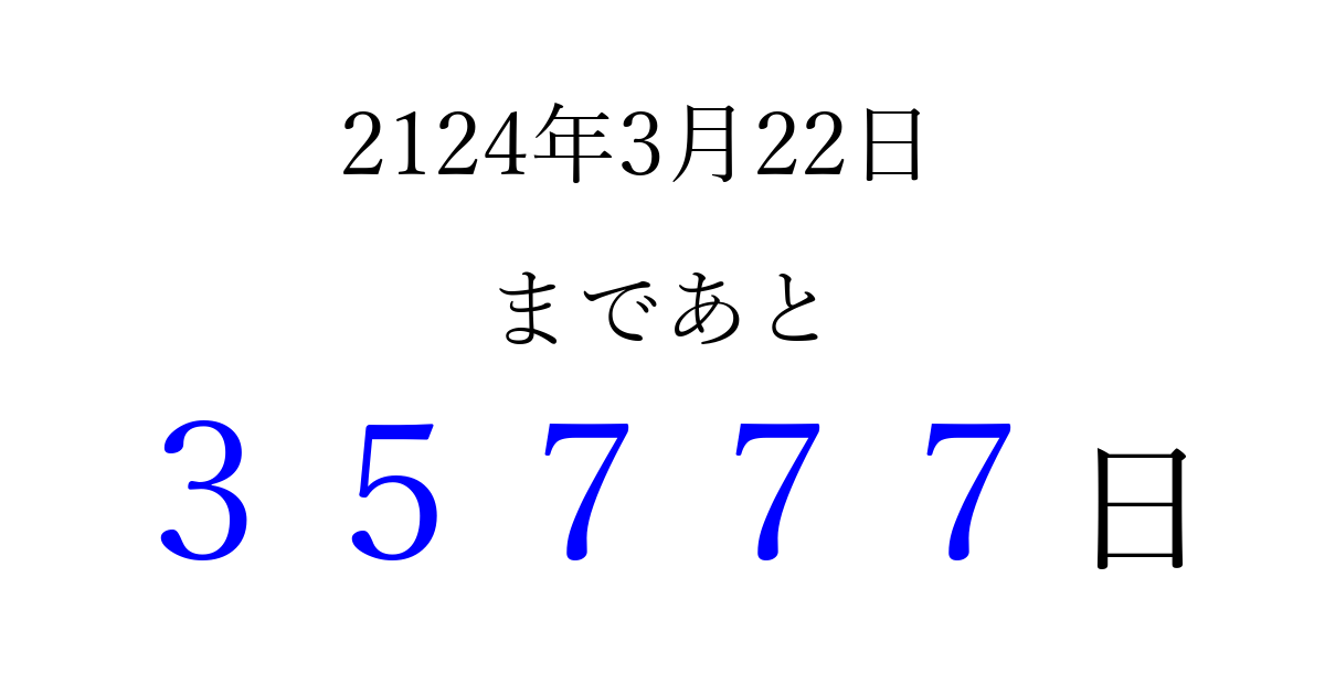 2124年3月22日(水)まで あと 99999 日です 追加すると、トップページからすぐ選べるようになります ※2026/04/08現在の結果です。 最新の状態に更新する ↓シェアして、タイムライン上にカウントダウンを表示しよう!↓ 📤 この結果を共有する Tweet シェア Threads Bluesky 別の日付でカウントダウン 2124年3月のカレンダー このページをブックマークに追加すると、いつでもカウントダウンを確認できます。 (PC: Ctrl+D / Mac: ⌘+D) hitome-notes.comでは以下のページも運営しています。 指定日と期間から日付を計算 | ガチャ確率計算・シミュレーション | プライバシー・ポリシー 運営者:Avocado