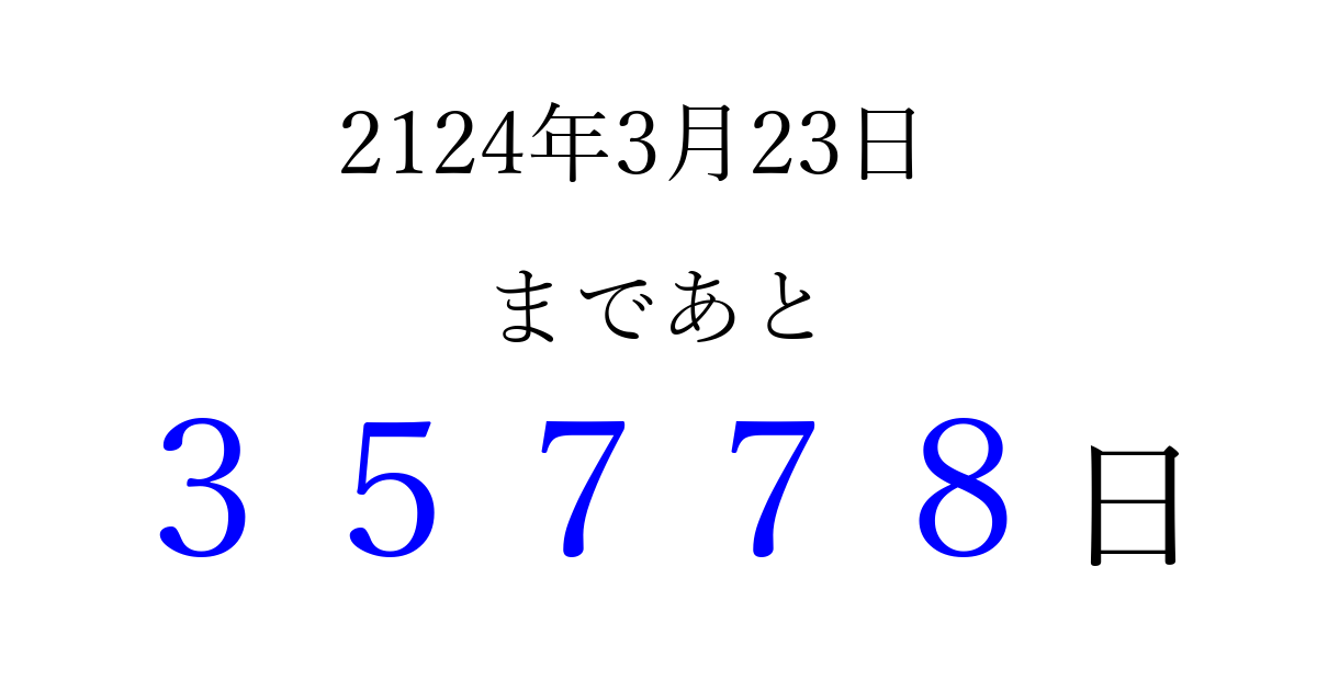 2124年3月23日(木)まで あと 99999 日です 追加すると、トップページからすぐ選べるようになります ※2026/04/08現在の結果です。 最新の状態に更新する ↓シェアして、タイムライン上にカウントダウンを表示しよう!↓ 📤 この結果を共有する Tweet シェア Threads Bluesky 別の日付でカウントダウン 2124年3月のカレンダー このページをブックマークに追加すると、いつでもカウントダウンを確認できます。 (PC: Ctrl+D / Mac: ⌘+D) hitome-notes.comでは以下のページも運営しています。 指定日と期間から日付を計算 | ガチャ確率計算・シミュレーション | プライバシー・ポリシー 運営者:Avocado