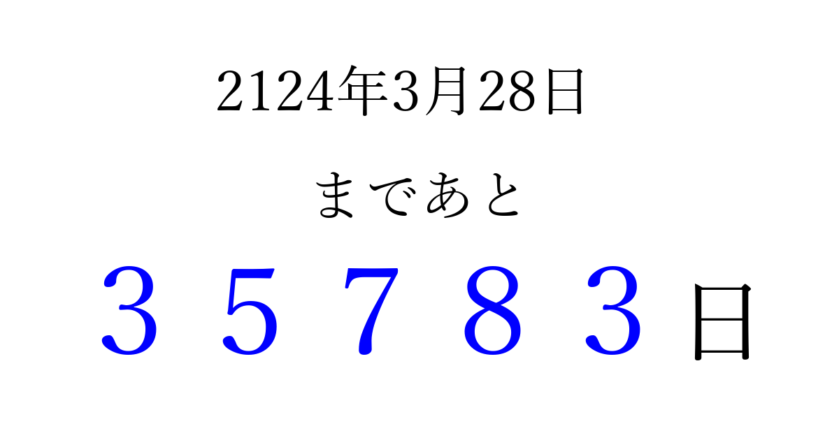 2124年3月28日(火)まで あと 99999 日です 追加すると、トップページからすぐ選べるようになります ※2026/04/08現在の結果です。 最新の状態に更新する ↓シェアして、タイムライン上にカウントダウンを表示しよう!↓ 📤 この結果を共有する Tweet シェア Threads Bluesky 別の日付でカウントダウン 2124年3月のカレンダー このページをブックマークに追加すると、いつでもカウントダウンを確認できます。 (PC: Ctrl+D / Mac: ⌘+D) hitome-notes.comでは以下のページも運営しています。 指定日と期間から日付を計算 | ガチャ確率計算・シミュレーション | プライバシー・ポリシー 運営者:Avocado