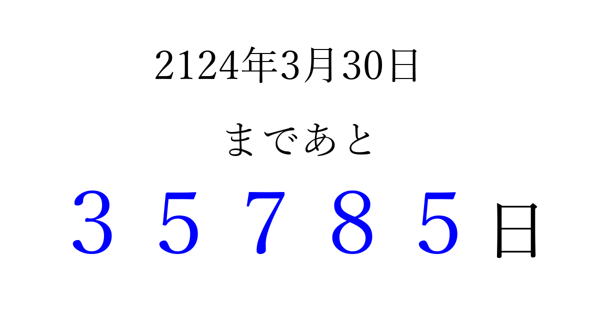 2124年3月30日(木)まで あと 99999 日です 追加すると、トップページからすぐ選べるようになります ※2026/04/08現在の結果です。 最新の状態に更新する ↓シェアして、タイムライン上にカウントダウンを表示しよう!↓ 📤 この結果を共有する Tweet シェア Threads Bluesky 別の日付でカウントダウン 2124年3月のカレンダー このページをブックマークに追加すると、いつでもカウントダウンを確認できます。 (PC: Ctrl+D / Mac: ⌘+D) hitome-notes.comでは以下のページも運営しています。 指定日と期間から日付を計算 | ガチャ確率計算・シミュレーション | プライバシー・ポリシー 運営者:Avocado