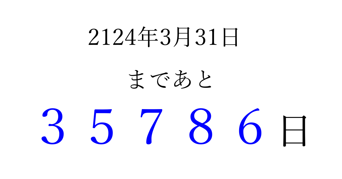 2124年3月31日(金)まで あと 99999 日です 追加すると、トップページからすぐ選べるようになります ※2026/04/08現在の結果です。 最新の状態に更新する ↓シェアして、タイムライン上にカウントダウンを表示しよう!↓ 📤 この結果を共有する Tweet シェア Threads Bluesky 別の日付でカウントダウン 2124年3月のカレンダー このページをブックマークに追加すると、いつでもカウントダウンを確認できます。 (PC: Ctrl+D / Mac: ⌘+D) hitome-notes.comでは以下のページも運営しています。 指定日と期間から日付を計算 | ガチャ確率計算・シミュレーション | プライバシー・ポリシー 運営者:Avocado