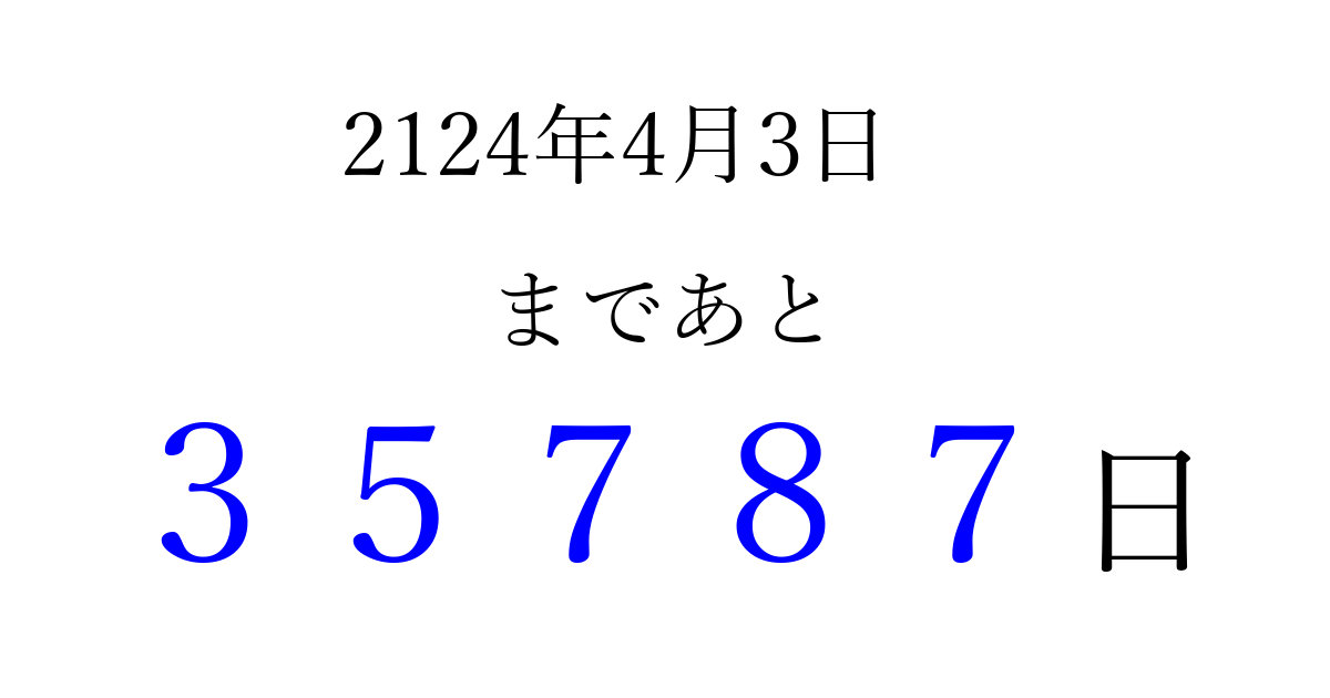 2124年4月3日(月)まで あと 99999 日です 追加すると、トップページからすぐ選べるようになります ※2026/04/10現在の結果です。 最新の状態に更新する ↓シェアして、タイムライン上にカウントダウンを表示しよう!↓ 📤 この結果を共有する Tweet シェア Threads Bluesky 別の日付でカウントダウン 2124年4月のカレンダー このページをブックマークに追加すると、いつでもカウントダウンを確認できます。 (PC: Ctrl+D / Mac: ⌘+D) hitome-notes.comでは以下のページも運営しています。 指定日と期間から日付を計算 | ガチャ確率計算・シミュレーション | プライバシー・ポリシー 運営者:Avocado