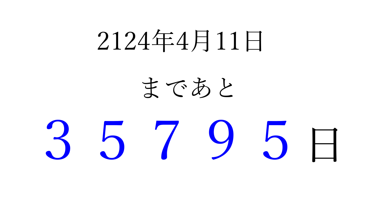 2124年4月11日(火)まで あと 99999 日です 追加すると、トップページからすぐ選べるようになります ※2026/04/10現在の結果です。 最新の状態に更新する ↓シェアして、タイムライン上にカウントダウンを表示しよう!↓ 📤 この結果を共有する Tweet シェア Threads Bluesky 別の日付でカウントダウン 2124年4月のカレンダー このページをブックマークに追加すると、いつでもカウントダウンを確認できます。 (PC: Ctrl+D / Mac: ⌘+D) hitome-notes.comでは以下のページも運営しています。 指定日と期間から日付を計算 | ガチャ確率計算・シミュレーション | プライバシー・ポリシー 運営者:Avocado