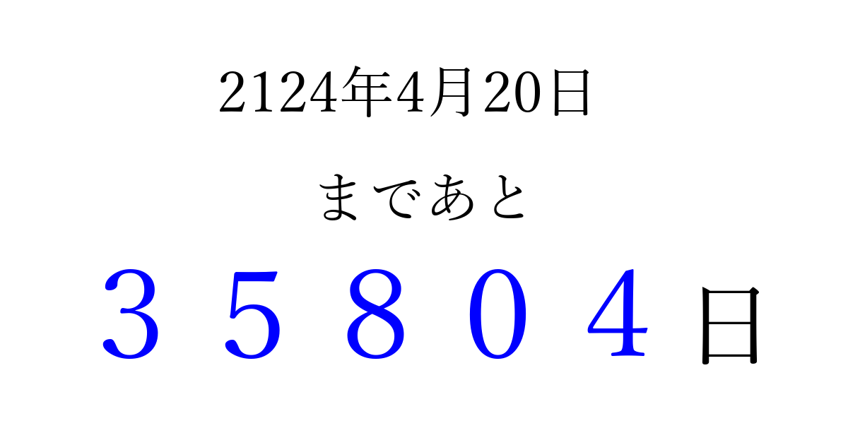 2124年4月20日(木)まで あと 99999 日です 追加すると、トップページからすぐ選べるようになります ※2026/04/10現在の結果です。 最新の状態に更新する ↓シェアして、タイムライン上にカウントダウンを表示しよう!↓ 📤 この結果を共有する Tweet シェア Threads Bluesky 別の日付でカウントダウン 2124年4月のカレンダー このページをブックマークに追加すると、いつでもカウントダウンを確認できます。 (PC: Ctrl+D / Mac: ⌘+D) hitome-notes.comでは以下のページも運営しています。 指定日と期間から日付を計算 | ガチャ確率計算・シミュレーション | プライバシー・ポリシー 運営者:Avocado
