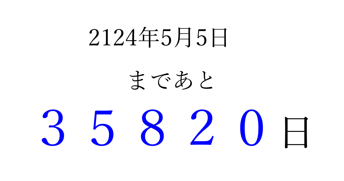2124年5月5日(金)まで あと 99999 日です 追加すると、トップページからすぐ選べるようになります ※2026/04/09現在の結果です。 最新の状態に更新する ↓シェアして、タイムライン上にカウントダウンを表示しよう!↓ 📤 この結果を共有する Tweet シェア Threads Bluesky 別の日付でカウントダウン 2124年5月のカレンダー このページをブックマークに追加すると、いつでもカウントダウンを確認できます。 (PC: Ctrl+D / Mac: ⌘+D) hitome-notes.comでは以下のページも運営しています。 指定日と期間から日付を計算 | ガチャ確率計算・シミュレーション | プライバシー・ポリシー 運営者:Avocado