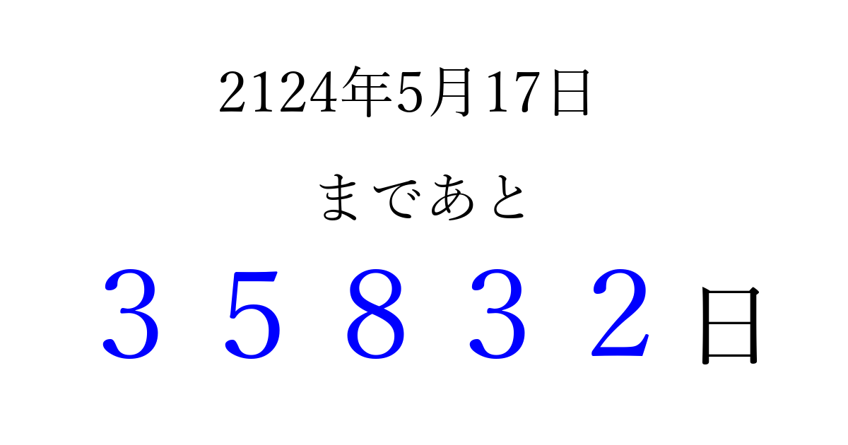2124年5月17日(水)まで あと 99999 日です 追加すると、トップページからすぐ選べるようになります ※2026/04/09現在の結果です。 最新の状態に更新する ↓シェアして、タイムライン上にカウントダウンを表示しよう!↓ 📤 この結果を共有する Tweet シェア Threads Bluesky 別の日付でカウントダウン 2124年5月のカレンダー このページをブックマークに追加すると、いつでもカウントダウンを確認できます。 (PC: Ctrl+D / Mac: ⌘+D) hitome-notes.comでは以下のページも運営しています。 指定日と期間から日付を計算 | ガチャ確率計算・シミュレーション | プライバシー・ポリシー 運営者:Avocado