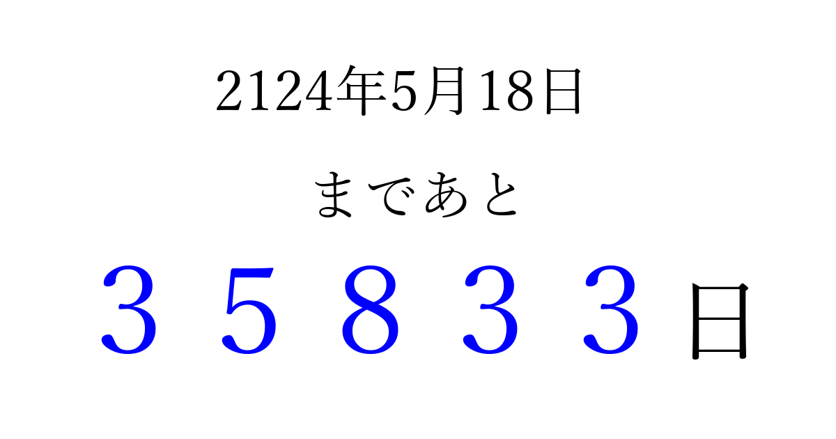 2124年5月18日(木)まで あと 99999 日です 追加すると、トップページからすぐ選べるようになります ※2026/04/09現在の結果です。 最新の状態に更新する ↓シェアして、タイムライン上にカウントダウンを表示しよう!↓ 📤 この結果を共有する Tweet シェア Threads Bluesky 別の日付でカウントダウン 2124年5月のカレンダー このページをブックマークに追加すると、いつでもカウントダウンを確認できます。 (PC: Ctrl+D / Mac: ⌘+D) hitome-notes.comでは以下のページも運営しています。 指定日と期間から日付を計算 | ガチャ確率計算・シミュレーション | プライバシー・ポリシー 運営者:Avocado