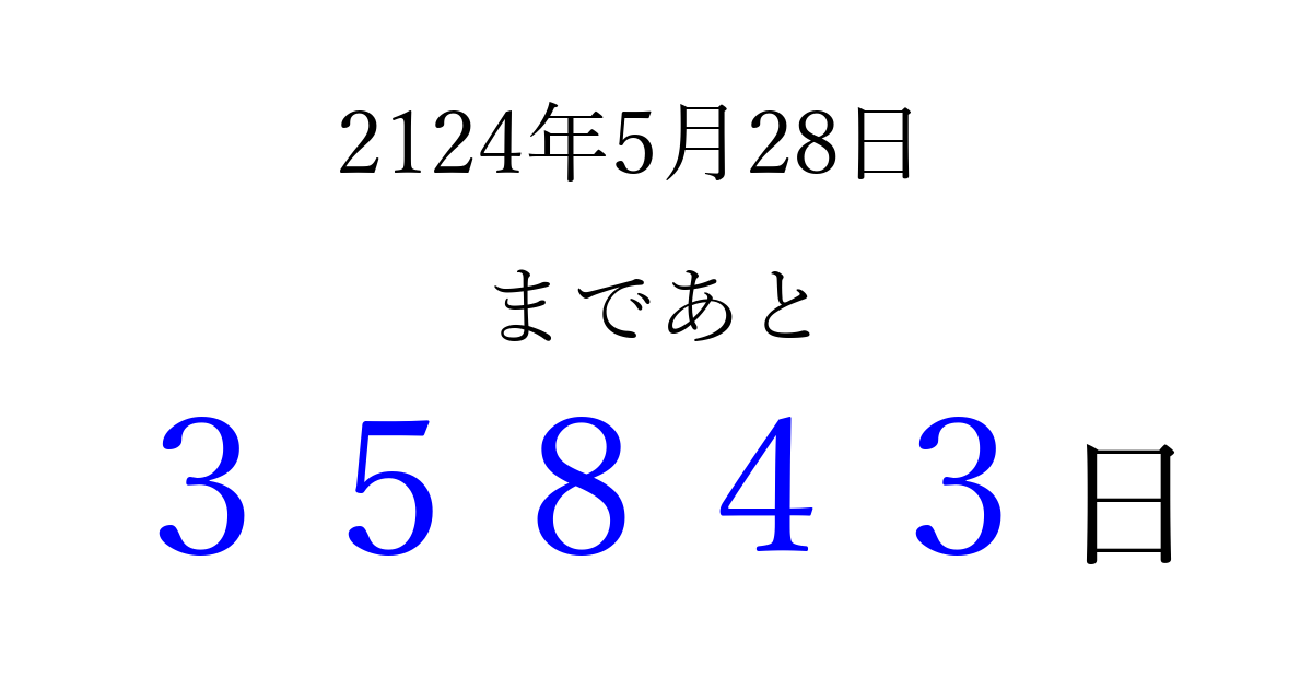 2124年5月28日(日)まで あと 99999 日です 追加すると、トップページからすぐ選べるようになります ※2026/04/09現在の結果です。 最新の状態に更新する ↓シェアして、タイムライン上にカウントダウンを表示しよう!↓ 📤 この結果を共有する Tweet シェア Threads Bluesky 別の日付でカウントダウン 2124年5月のカレンダー このページをブックマークに追加すると、いつでもカウントダウンを確認できます。 (PC: Ctrl+D / Mac: ⌘+D) hitome-notes.comでは以下のページも運営しています。 指定日と期間から日付を計算 | ガチャ確率計算・シミュレーション | プライバシー・ポリシー 運営者:Avocado