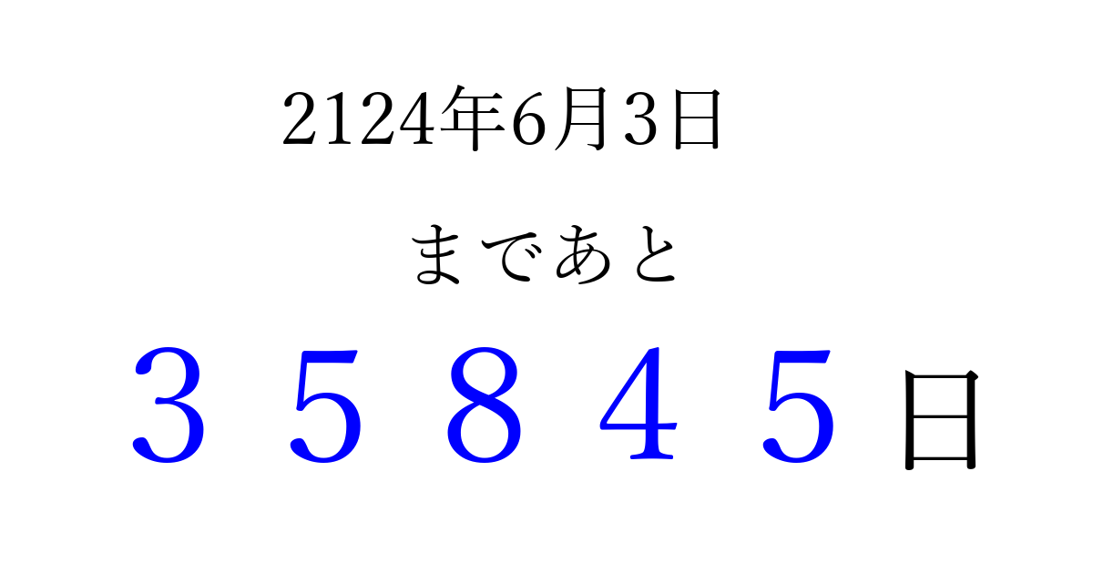 2124年6月3日(土)まで あと 99999 日です 追加すると、トップページからすぐ選べるようになります ※2026/04/13現在の結果です。 最新の状態に更新する ↓シェアして、タイムライン上にカウントダウンを表示しよう!↓ 📤 この結果を共有する Tweet シェア Threads Bluesky 別の日付でカウントダウン 2124年6月のカレンダー このページをブックマークに追加すると、いつでもカウントダウンを確認できます。 (PC: Ctrl+D / Mac: ⌘+D) hitome-notes.comでは以下のページも運営しています。 指定日と期間から日付を計算 | ガチャ確率計算・シミュレーション | プライバシー・ポリシー 運営者:Avocado
