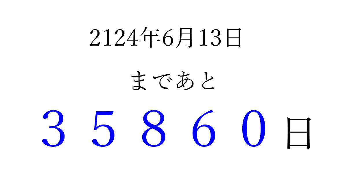 2124年6月13日(火)まで あと 99999 日です 追加すると、トップページからすぐ選べるようになります ※2026/04/08現在の結果です。 最新の状態に更新する ↓シェアして、タイムライン上にカウントダウンを表示しよう!↓ 📤 この結果を共有する Tweet シェア Threads Bluesky 別の日付でカウントダウン 2124年6月のカレンダー このページをブックマークに追加すると、いつでもカウントダウンを確認できます。 (PC: Ctrl+D / Mac: ⌘+D) hitome-notes.comでは以下のページも運営しています。 指定日と期間から日付を計算 | ガチャ確率計算・シミュレーション | プライバシー・ポリシー 運営者:Avocado