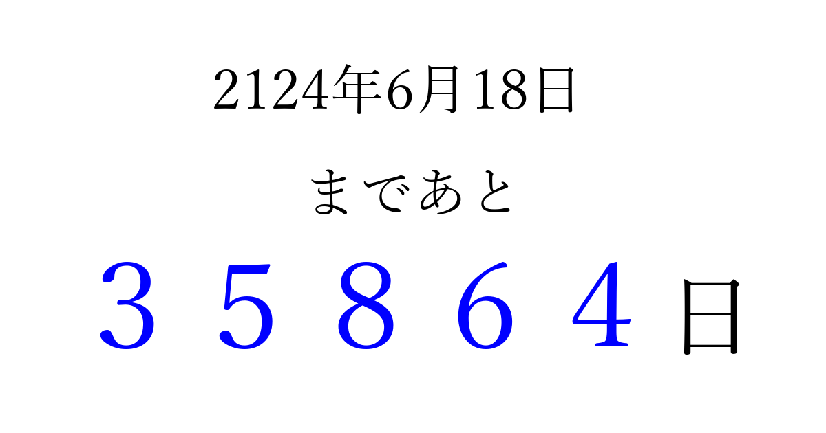 2124年6月18日(日)まで あと 99999 日です 追加すると、トップページからすぐ選べるようになります ※2026/04/09現在の結果です。 最新の状態に更新する ↓シェアして、タイムライン上にカウントダウンを表示しよう!↓ 📤 この結果を共有する Tweet シェア Threads Bluesky 別の日付でカウントダウン 2124年6月のカレンダー このページをブックマークに追加すると、いつでもカウントダウンを確認できます。 (PC: Ctrl+D / Mac: ⌘+D) hitome-notes.comでは以下のページも運営しています。 指定日と期間から日付を計算 | ガチャ確率計算・シミュレーション | プライバシー・ポリシー 運営者:Avocado