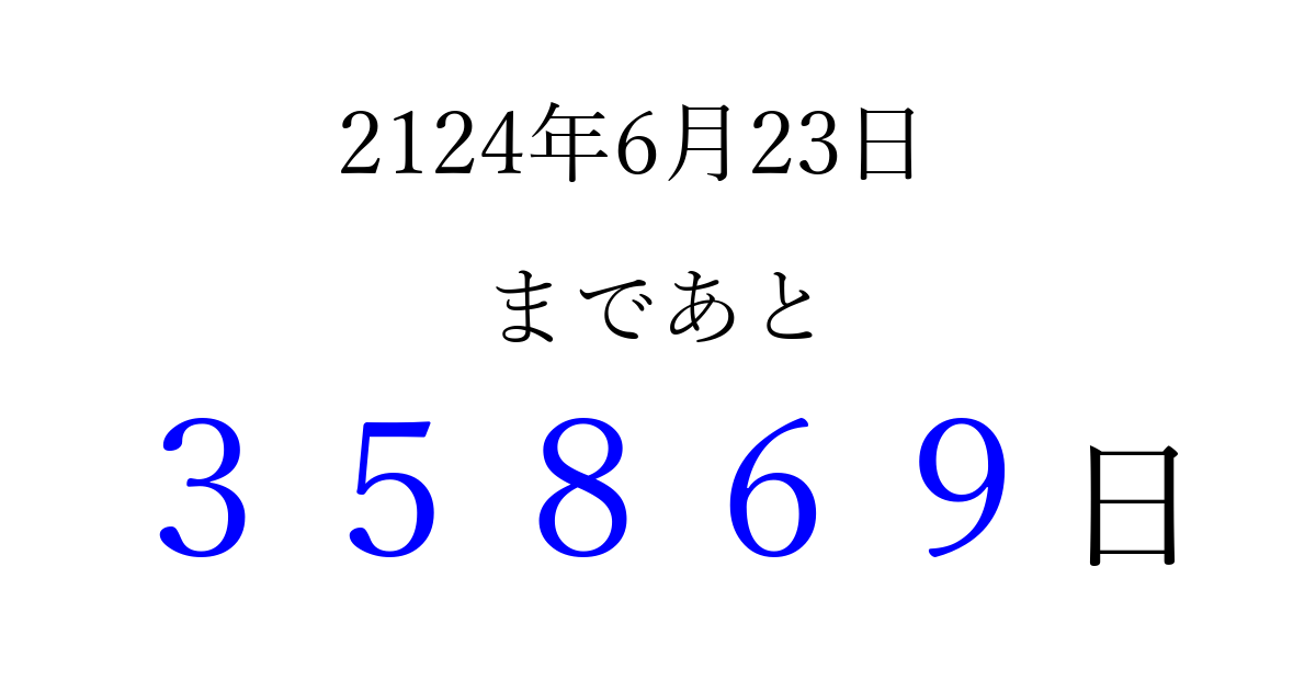 2124年6月23日(金)まで あと 99999 日です 追加すると、トップページからすぐ選べるようになります ※2026/04/09現在の結果です。 最新の状態に更新する ↓シェアして、タイムライン上にカウントダウンを表示しよう!↓ 📤 この結果を共有する Tweet シェア Threads Bluesky 別の日付でカウントダウン 2124年6月のカレンダー このページをブックマークに追加すると、いつでもカウントダウンを確認できます。 (PC: Ctrl+D / Mac: ⌘+D) hitome-notes.comでは以下のページも運営しています。 指定日と期間から日付を計算 | ガチャ確率計算・シミュレーション | プライバシー・ポリシー 運営者:Avocado