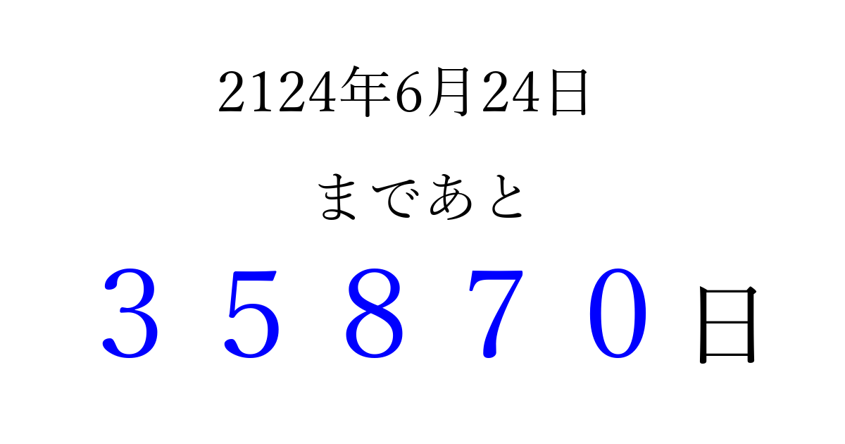 2124年6月24日(土)まで あと 99999 日です 追加すると、トップページからすぐ選べるようになります ※2026/04/09現在の結果です。 最新の状態に更新する ↓シェアして、タイムライン上にカウントダウンを表示しよう!↓ 📤 この結果を共有する Tweet シェア Threads Bluesky 別の日付でカウントダウン 2124年6月のカレンダー このページをブックマークに追加すると、いつでもカウントダウンを確認できます。 (PC: Ctrl+D / Mac: ⌘+D) hitome-notes.comでは以下のページも運営しています。 指定日と期間から日付を計算 | ガチャ確率計算・シミュレーション | プライバシー・ポリシー 運営者:Avocado