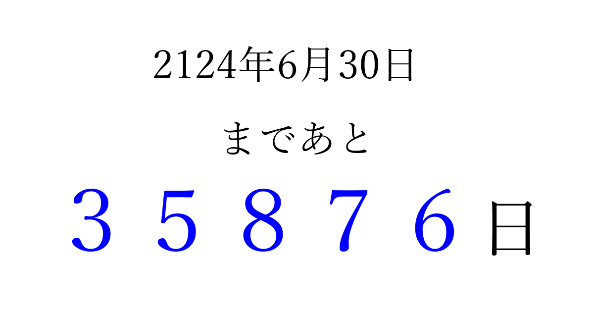 2124年6月30日(金)まで あと 99999 日です 追加すると、トップページからすぐ選べるようになります ※2026/04/09現在の結果です。 最新の状態に更新する ↓シェアして、タイムライン上にカウントダウンを表示しよう!↓ 📤 この結果を共有する Tweet シェア Threads Bluesky 別の日付でカウントダウン 2124年6月のカレンダー このページをブックマークに追加すると、いつでもカウントダウンを確認できます。 (PC: Ctrl+D / Mac: ⌘+D) hitome-notes.comでは以下のページも運営しています。 指定日と期間から日付を計算 | ガチャ確率計算・シミュレーション | プライバシー・ポリシー 運営者:Avocado